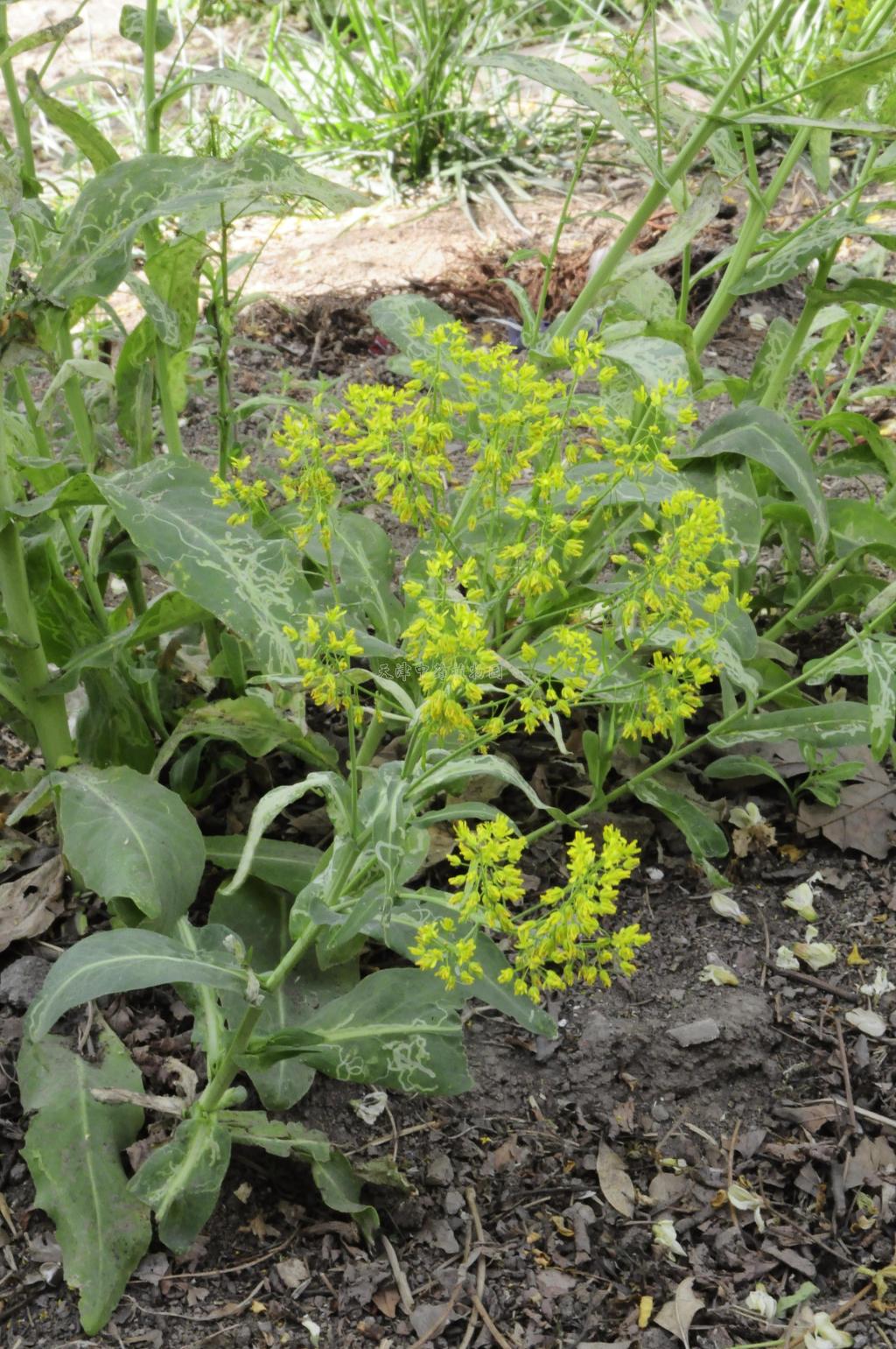 【植物形态】 二年生草本,高30~120cm;主根圆柱形,长10~30cm。茎直立,上部多分枝,无毛,稍带粉霜。基生叶莲座状,倒卵形至长圆状披针形,长5~15cm,宽1~3cm,蓝绿色,全缘或稍有波状牙齿,有短叶柄,茎生叶长圆形至长圆披针形,长2~9cm,基部箭形,半抱茎,全缘或有不明显锯齿。圆锥花序;花黄色,直径4~5mm;萼片长圆形,花瓣倒披针形,长3~4mm,具短爪。短角果长圆形,长9~13mm,宽2~4mm,扁平,边缘有翅,无毛,顶端凹缺有短尖,基部渐狭,中部稍宽,中肋细;果梗长约10mm,略外折。种子1个,椭圆形,长3~4mm,棕色。花果期4~6月。