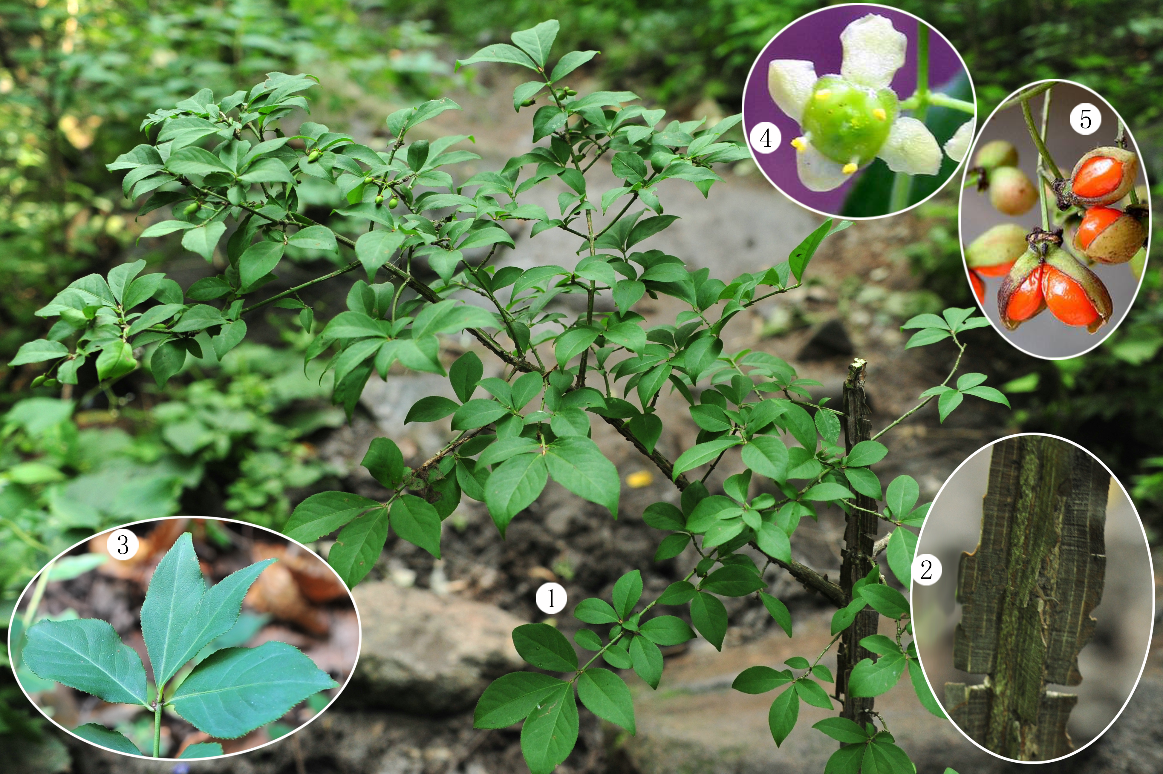 ①卫矛植株 ②木栓翅 ③叶 ④花 ⑤果实