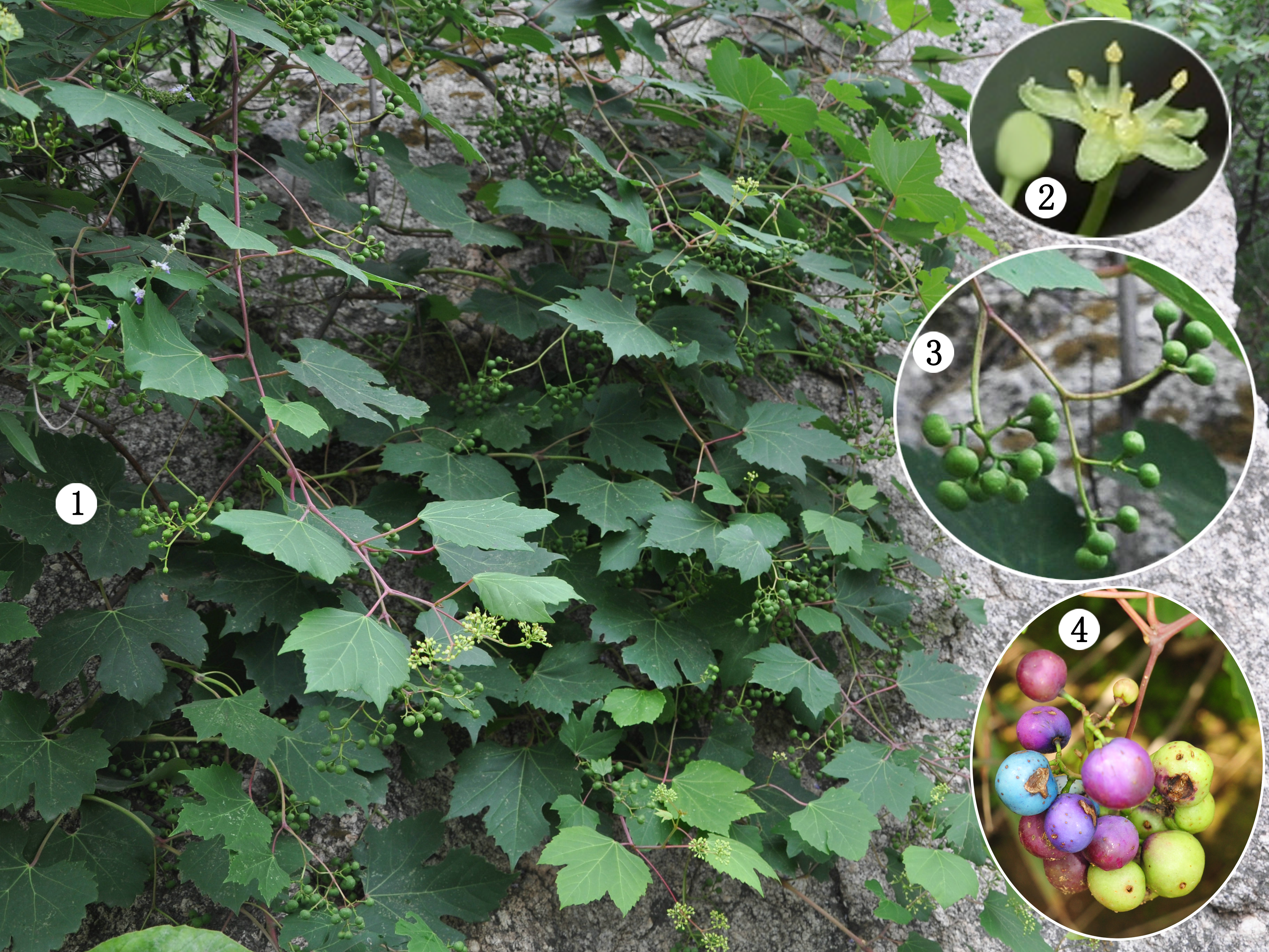 ①葎叶蛇葡萄植株 ②花 ③果序 ④果实
