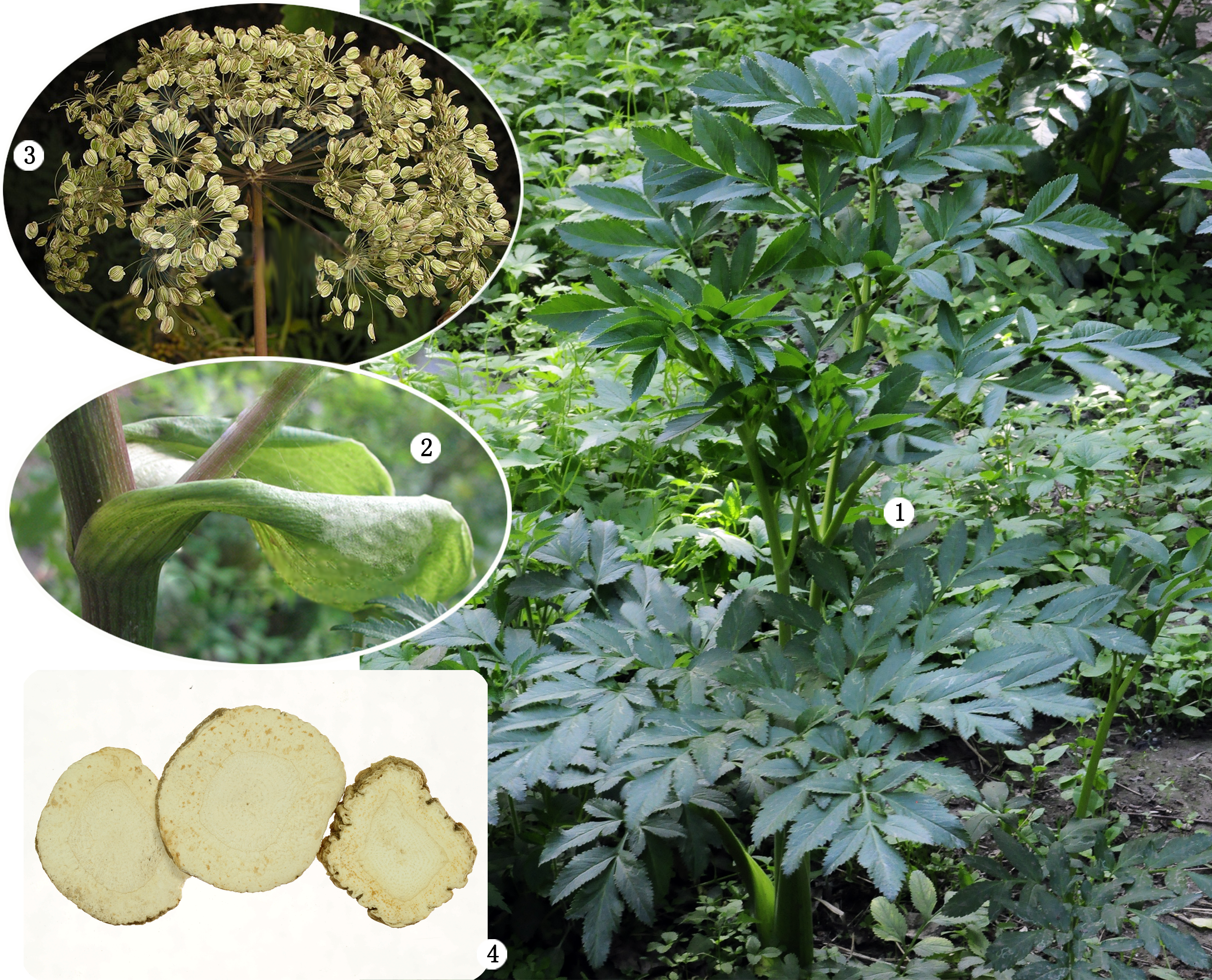 ①白芷植株 ②叶鞘 ③果序 ④药材饮片