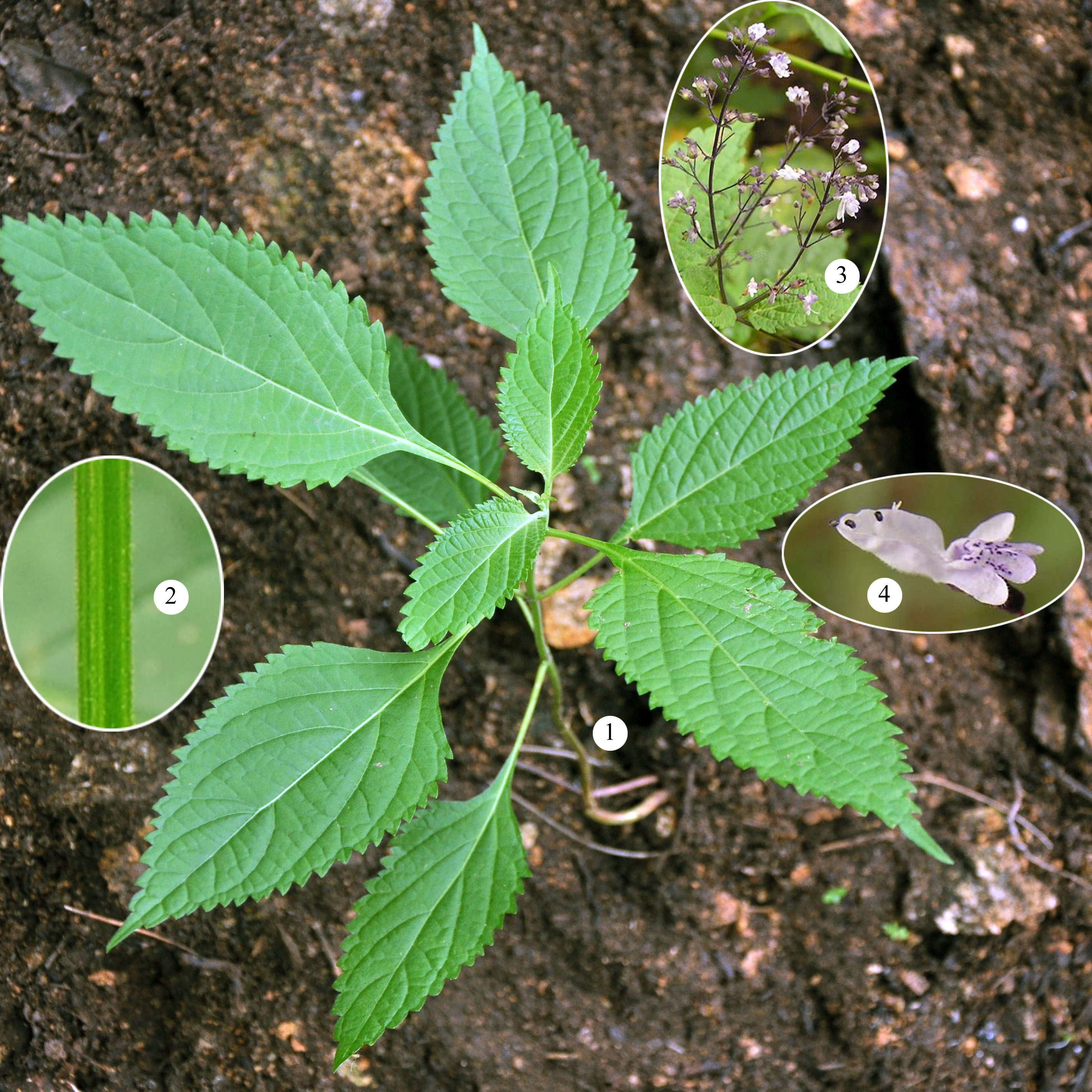 【植物形态】 多年生草本,根茎木质,粗大。茎直立,高可达1.5m,茎四棱,多分枝,有短柔毛。叶对生,卵形或阔卵形,长6.5~13cm,宽3~7cm,先端具卵形或披针形而渐尖的顶齿,基部阔楔形,边缘有粗大的钝锯齿,上面绿色,下面暗绿,两面疏被短柔毛及腺点;叶柄长0.5~3cm。圆锥花序顶生,由3~7花的聚伞花序组成,苞片卵形,被微柔毛。花萼筒状钟形,常蓝色,被贴生微柔毛,5齿,齿三角形,为萼长1/3,近等大,果时萼增大;花冠蓝色,长约5.5mm,花冠筒长约2.5mm,冠檐二唇形,上唇反折,先端4圆裂,具深色斑点,外被短柔毛,下唇阔卵圆形;雄蕊4,伸出,花药黄色,花丝有髯毛;花柱先端相等2浅裂,伸出花冠外。花盘环状。成熟小坚果卵状三棱形,长约1.5mm,黄褐色,顶端瘤状突起。花果期6~9月。