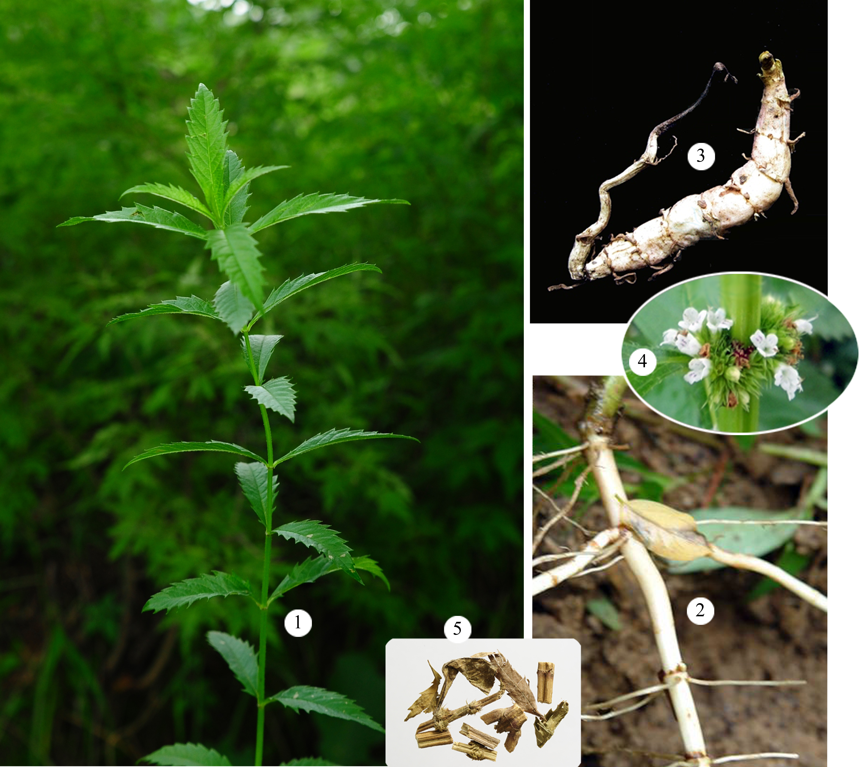 ①原植株 ②根茎 ③膨大根茎 ④花序 ⑤药材饮片(泽兰)