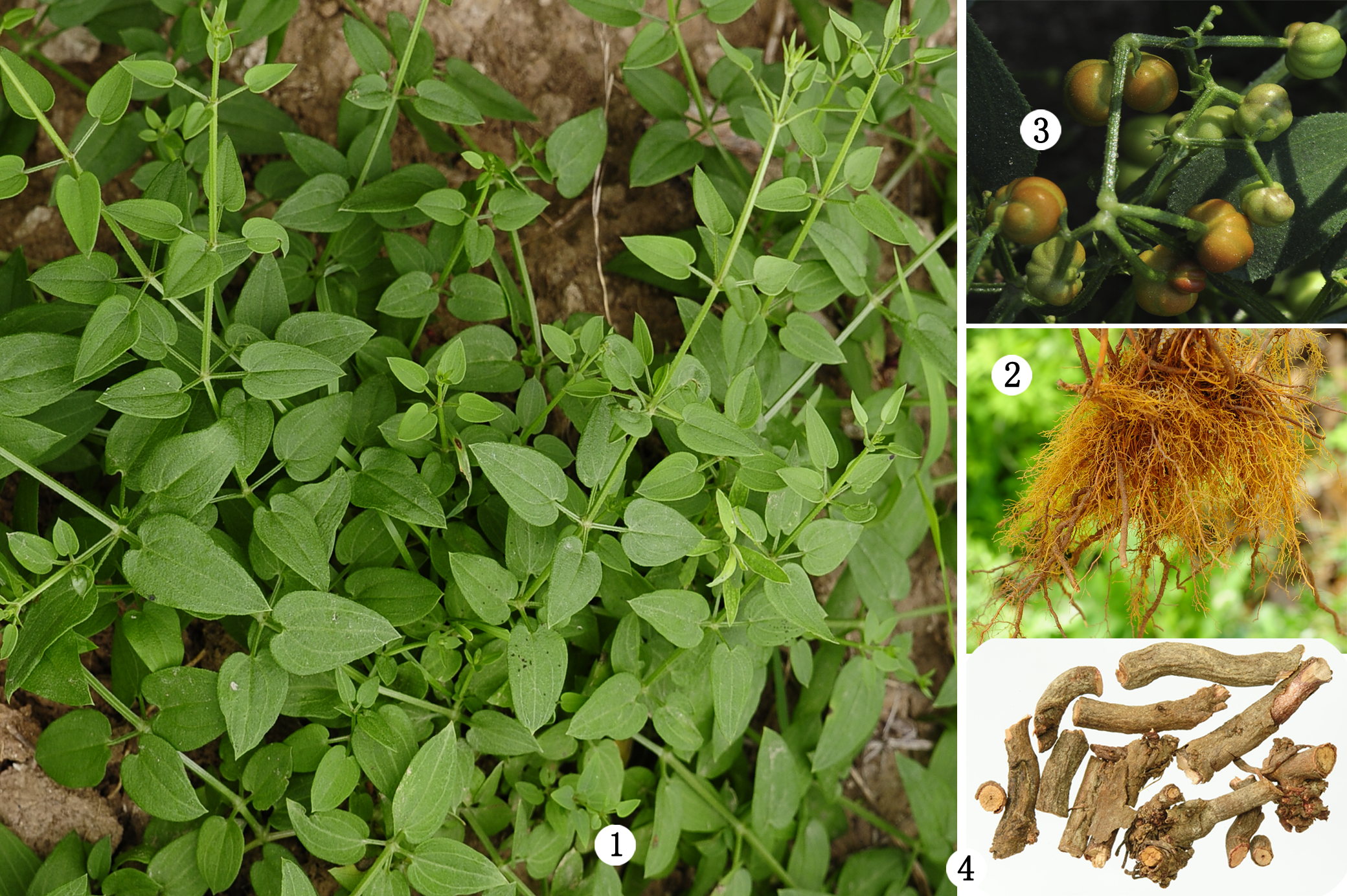 ①茜草植株 ②根 ③果实 ④药材饮片(茜草)