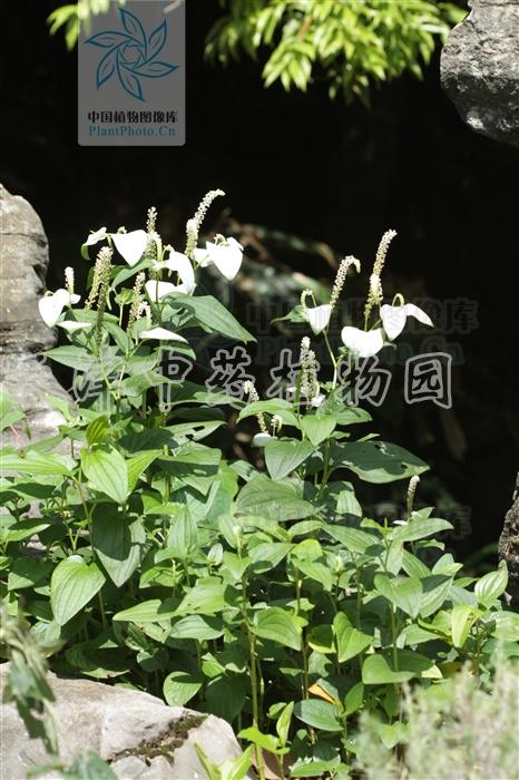 【植物形态】 湿生草本,高约1米余;茎粗壮,有纵长粗棱和沟槽,下部伏地,常带白色,上部直立,绿色。叶纸质,密生腺点,阔卵形至卵状披针形,长10-20厘米,宽5-10厘米,顶端短尖或渐尖,基部心形或斜心形,两面均无毛,上部的叶较小,茎顶端的2-3片于花期常为白色,呈花瓣状;叶脉5-7条,均自基部发出,如为7脉时,则最外1对纤细,斜升约2-2.5厘米即弯拱网结,网状脉明显;叶柄长1-3厘米,无毛,基部与托叶合生成鞘状,略抱茎。花序白色,长12-20厘米;总花梗长3-4.5厘米,无毛,但花序轴密被短柔毛;苞片近匙形,上部圆,无毛或有疏缘毛,下部线形,被柔毛,且贴生于花梗上;雄蕊6枚,花药长圆形,纵裂,花丝比花药略长。果近球形,直径约3毫米,表面多疣状凸起。花期4-6月。