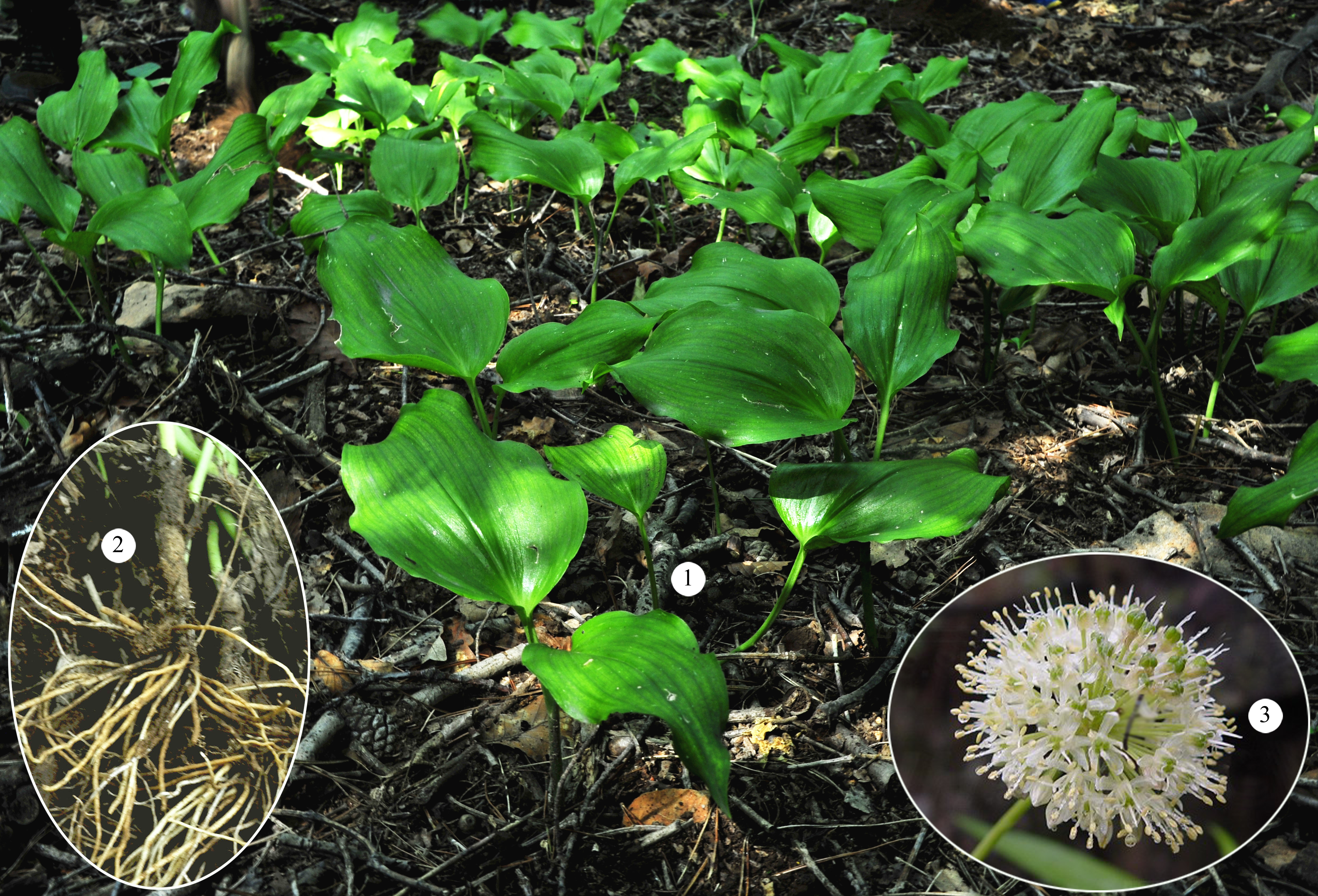 ① 茖葱植株 ②鳞茎 ③花序