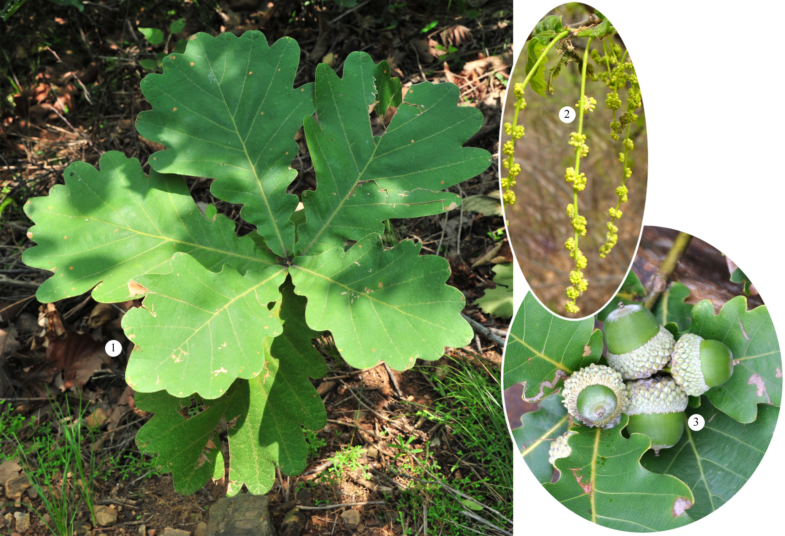 ① 蒙古栎植株 ②雄花序 ③果实
