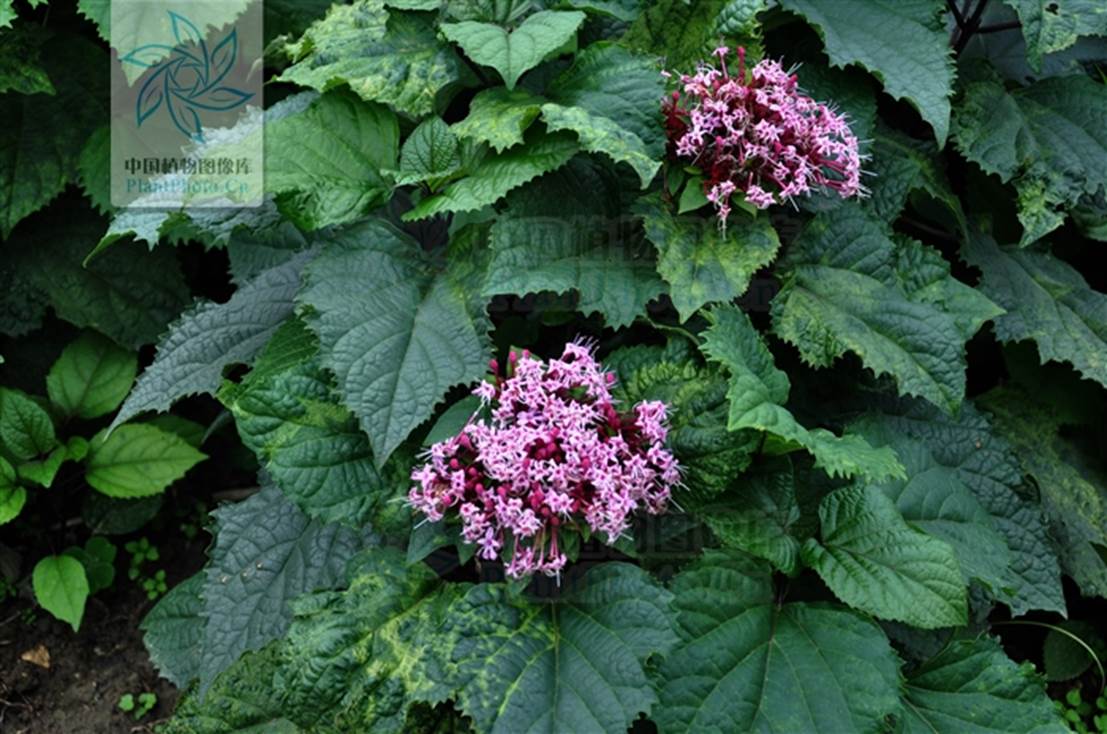 【植物形态】 灌木,高1-2米,植株有臭味;花序轴、叶柄密被褐色、黄褐色或紫色脱落性的柔毛;小枝近圆形,皮孔显著。叶片纸质,宽卵形或卵形,长 8-20厘米,宽5-15厘米,顶端尖或渐尖,基部宽楔形、截形或心形,边缘具粗或细锯齿,侧脉4-6对,表面散生短柔毛,背面疏生短柔毛和散生腺点或无 毛,基部脉腋有数个盘状腺体;叶柄长4-17厘米。伞房状聚伞花序顶生,密集;苞片叶状,披针形或卵状披针形,长约3厘米,早落或花时不落,早落后在 花序梗上残留凸起的痕迹,小苞片披针形,长约1.8厘米;花萼钟状,长2-6毫米,被短柔毛及少数盘状腺体,萼齿三角形或狭三角形,长1-3毫米;花冠淡 红色、红色或紫红色,花冠管长2-3厘米,裂片倒卵形,长5-8毫米;雄蕊及花柱均突出花冠外;花柱短于、等于或稍长于雄蕊;柱头2裂,子房4室。核果 近球形,径0.6-1.2厘米,成熟时蓝黑色。花果期5-11月